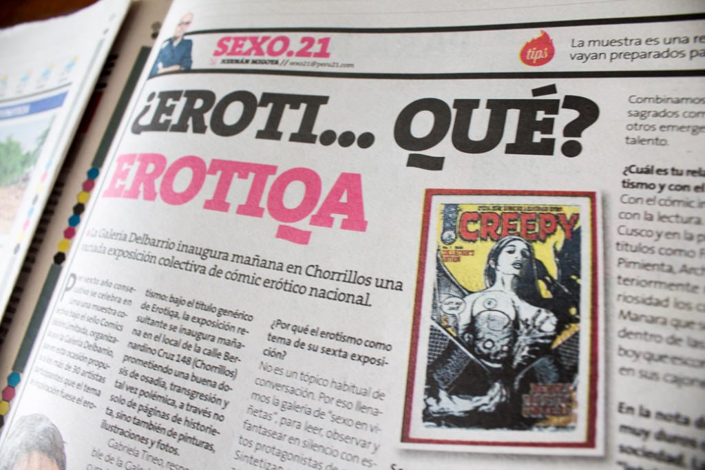 Página entera sobre la exposición Comics en Edición Limitada n° 6 EROTIQA en el diario Peru21. Miércoles 3 de Junio. Mi obra “Let Me In“, presentada en formato art-print Giclée sobre papel…