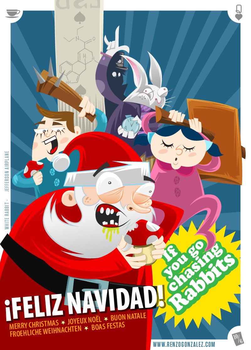 Desde 2007, cada 24 de diciembre ilustro y publico una tarjeta navideña como saludo ritual. En cada entrega, el viejo pascuero enfrenta una desgracia distinta, siempre acompañada por una canción. Esta vez, el soundtrack es White Rabbit, de los legendarios Jefferson Airplane.