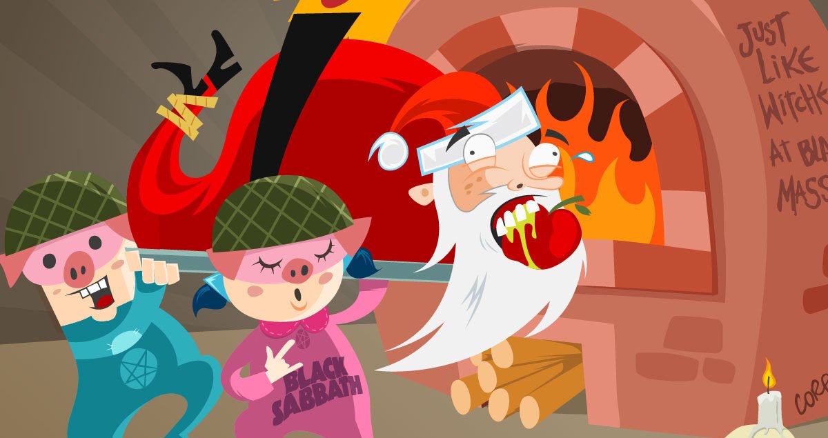 Dos niños disfrazados con máscaras de cerdos cargan a Santa atado de manos y pies sobre una bandeja metálica. Lo llevan directo a un horno de piedra encendido con leñas, mientras a un lado se lee la frase: “Just like witches at black masses.”